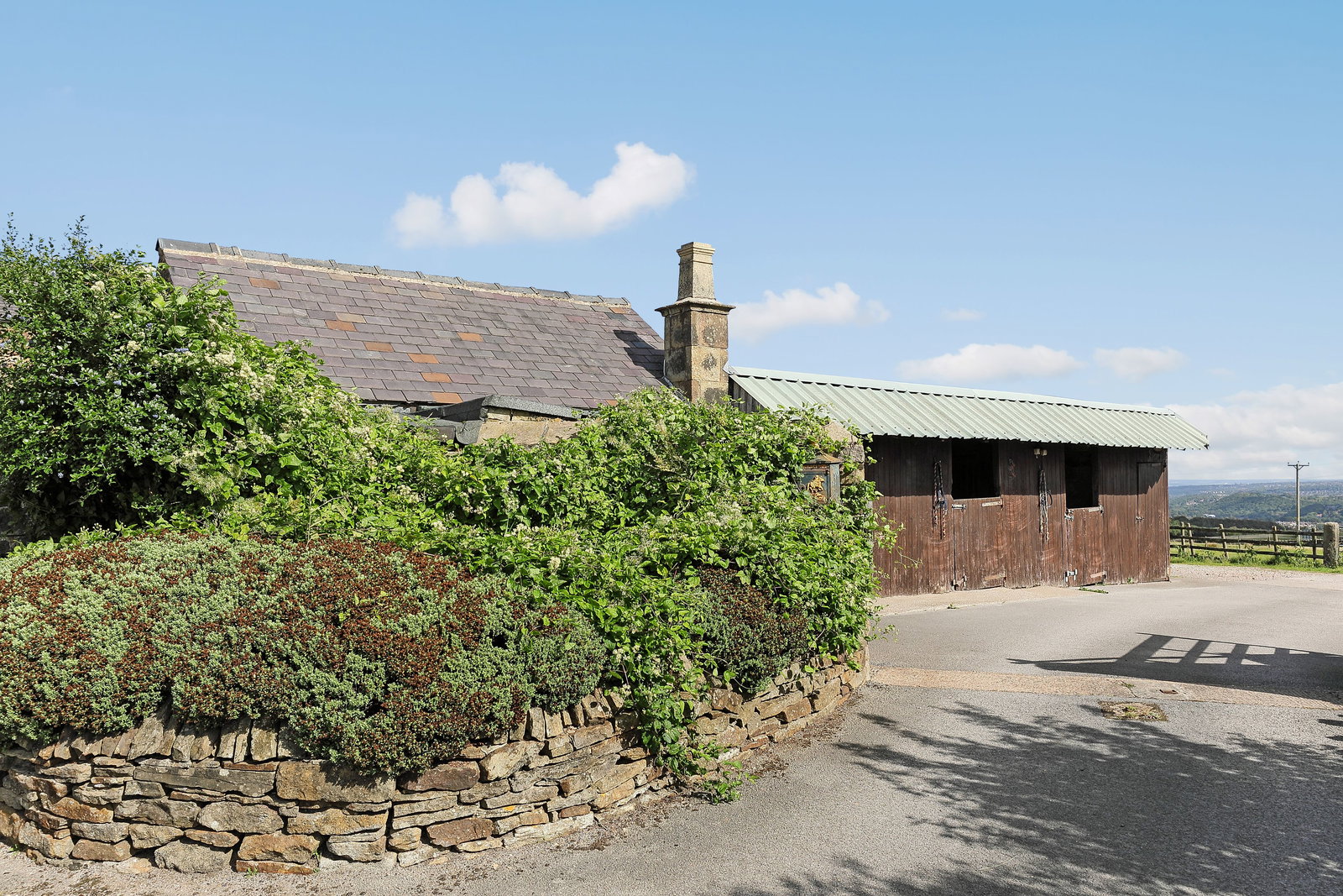 The property stands within an impressive plot of approximately 8.5 acres, offering a wonderful blend of landscaped gardens and extensive equestrian facilities. To the front, a beautifully kept lawned garden is enclosed by traditional dry-stone walling, with a flagged pathway leading up to the house and creating a charming first impression. A large hard-standing area provides ample vehicle parking, perfect for family living or equestrian use.