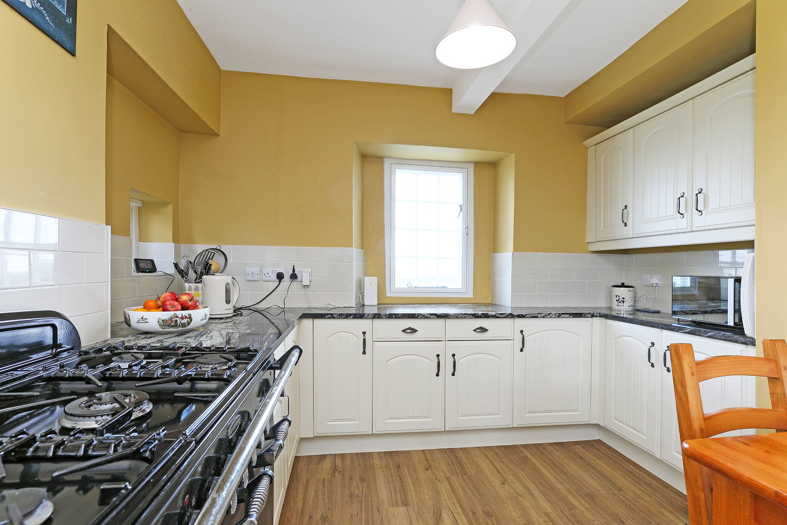 A superbly appointed kitchen, ideal for both everyday family life and entertaining. It features a comprehensive range of attractive fitted wall and base units, centred around a traditional Range cooker. The kitchen is finished with beautiful granite worktops and a Belfast sink, while windows to three elevations flood the room with light and frame breathtaking countryside views. A half-glazed entrance door opens directly onto the private rear garden, and the multi-panel vinyl flooring adds a practical yet elegant touch.