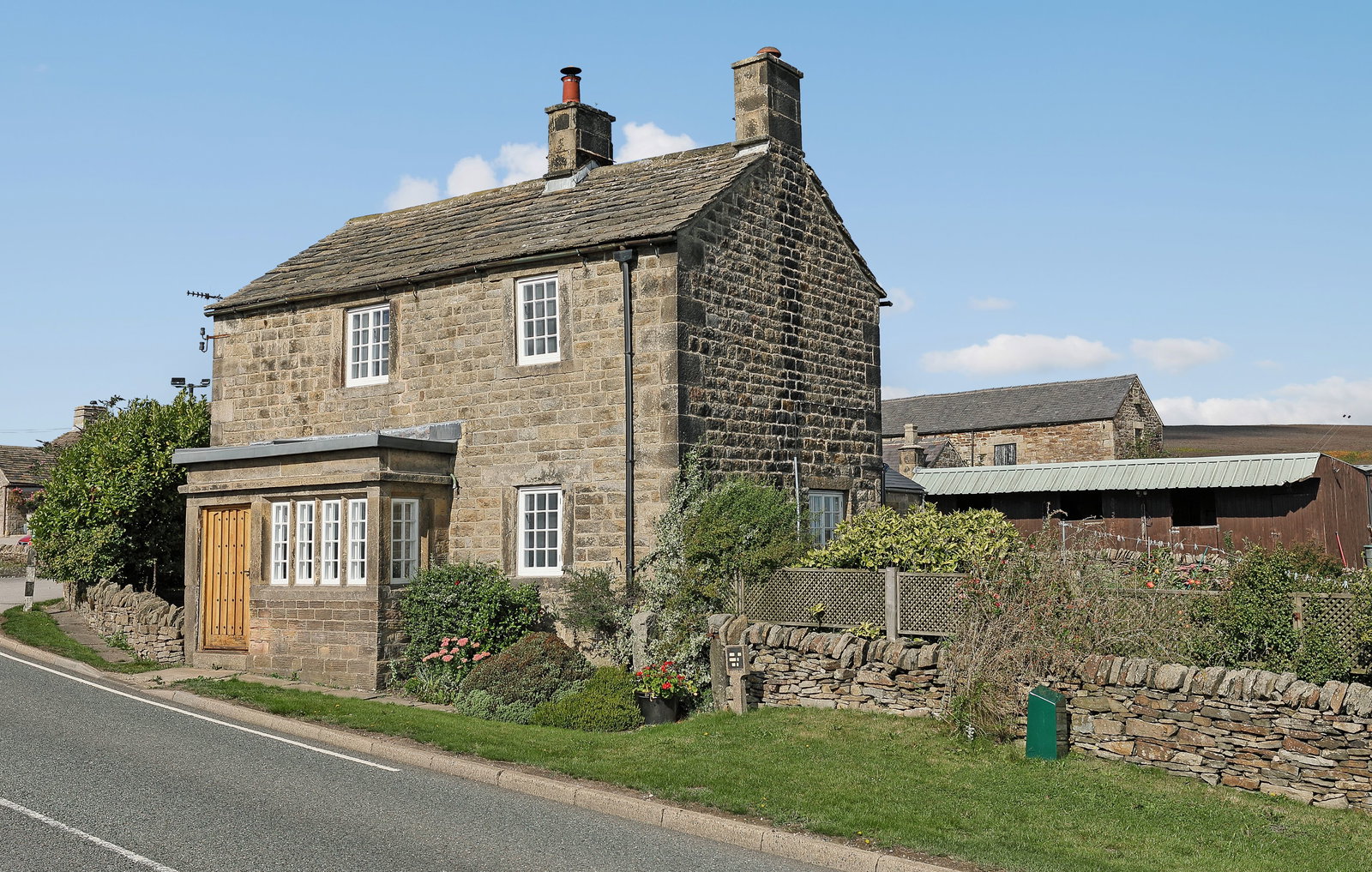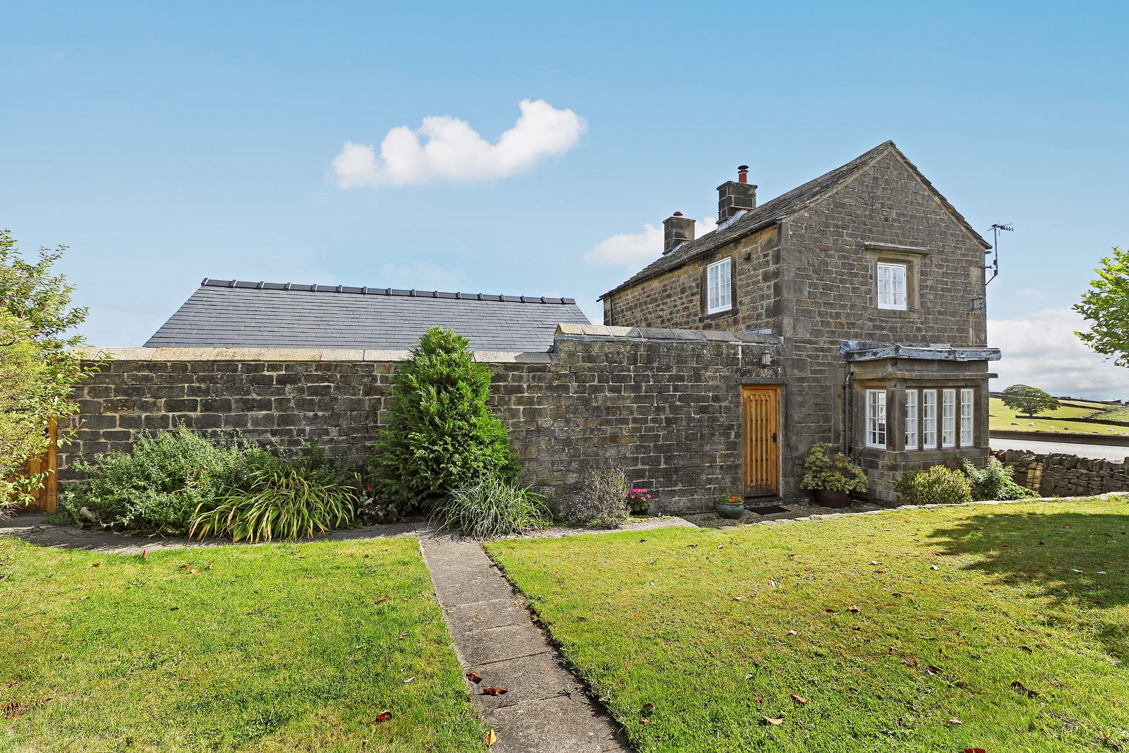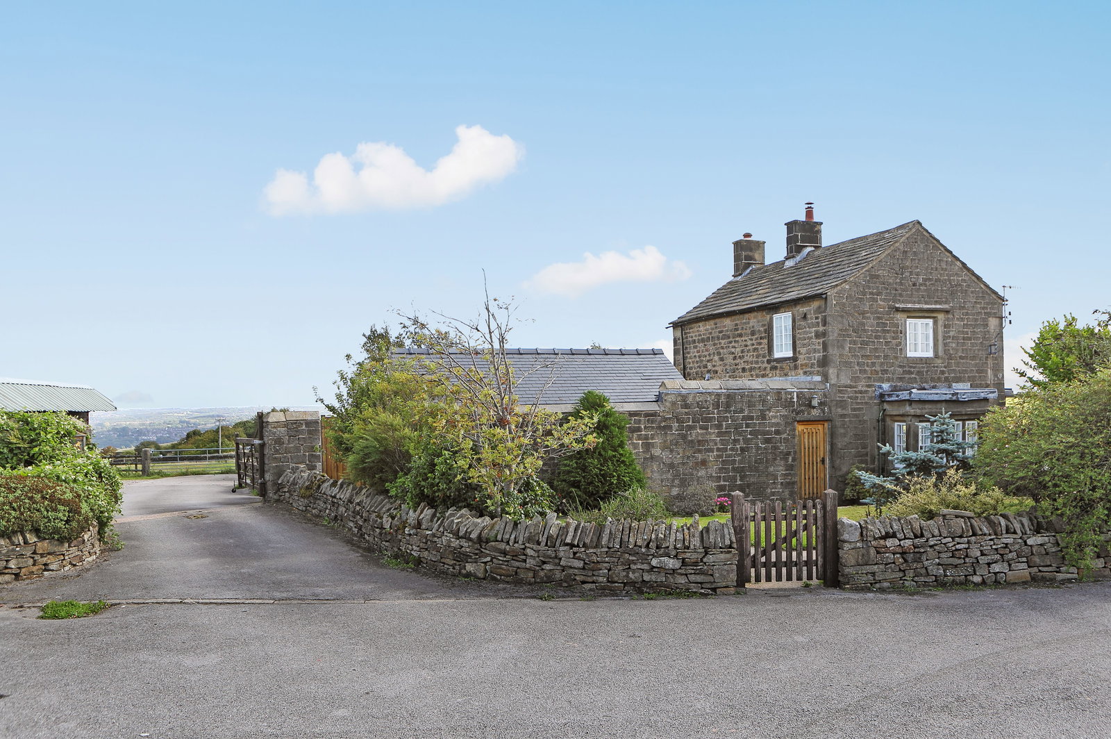 The property stands within an impressive plot of approximately 8.5 acres, offering a wonderful blend of landscaped gardens and extensive equestrian facilities. To the front, a beautifully kept lawned garden is enclosed by traditional dry-stone walling, with a flagged pathway leading up to the house and creating a charming first impression. A large hard-standing area provides ample vehicle parking, perfect for family living or equestrian use.