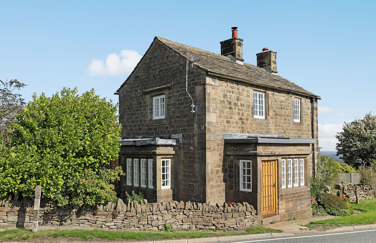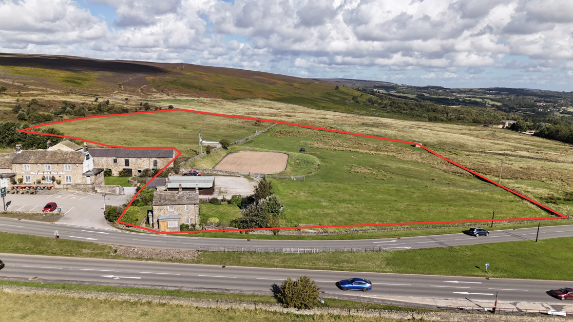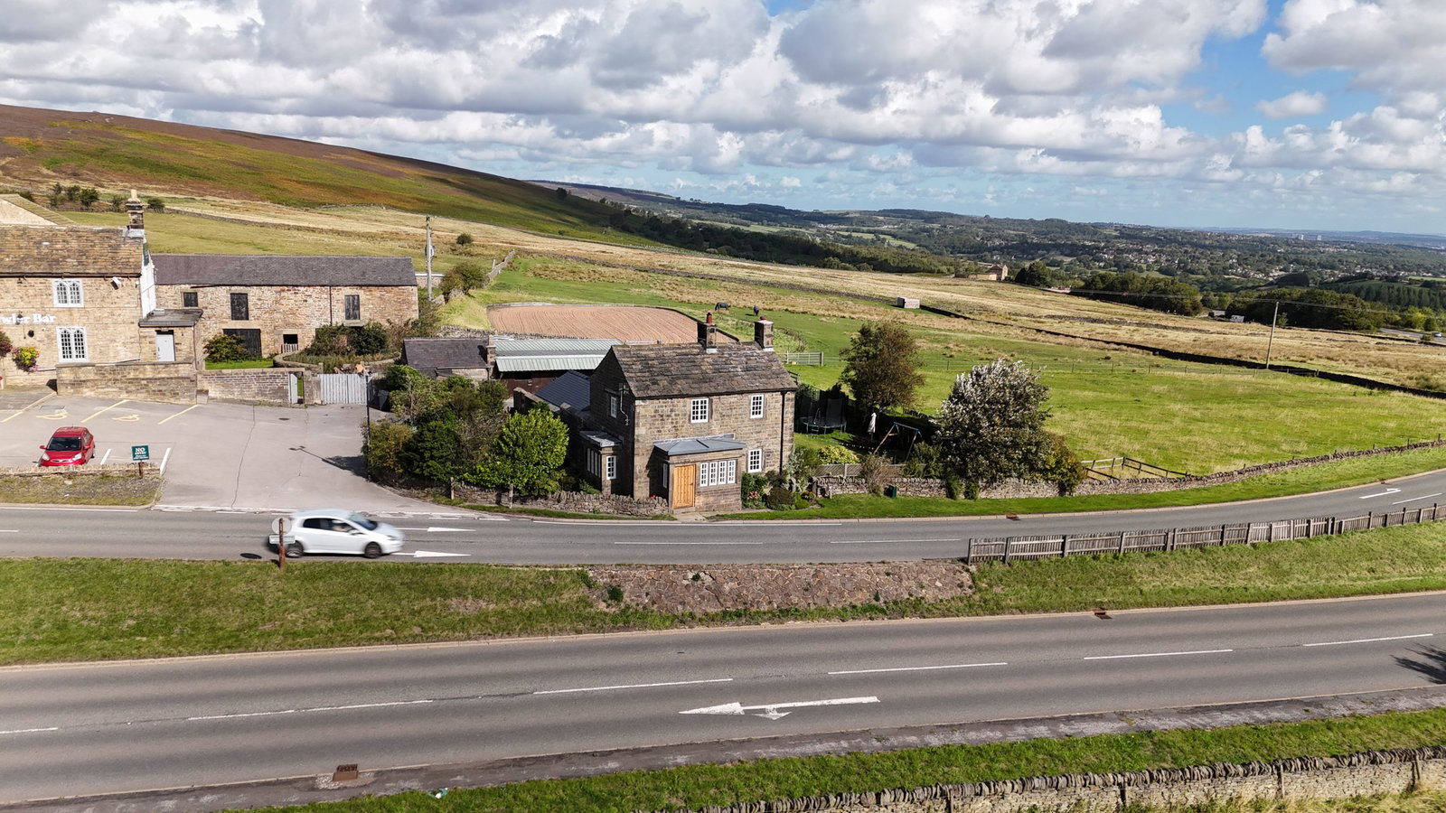 The property stands within an impressive plot of approximately 8.5 acres, offering a wonderful blend of landscaped gardens and extensive equestrian facilities. To the front, a beautifully kept lawned garden is enclosed by traditional dry-stone walling, with a flagged pathway leading up to the house and creating a charming first impression. A large hard-standing area provides ample vehicle parking, perfect for family living or equestrian use.