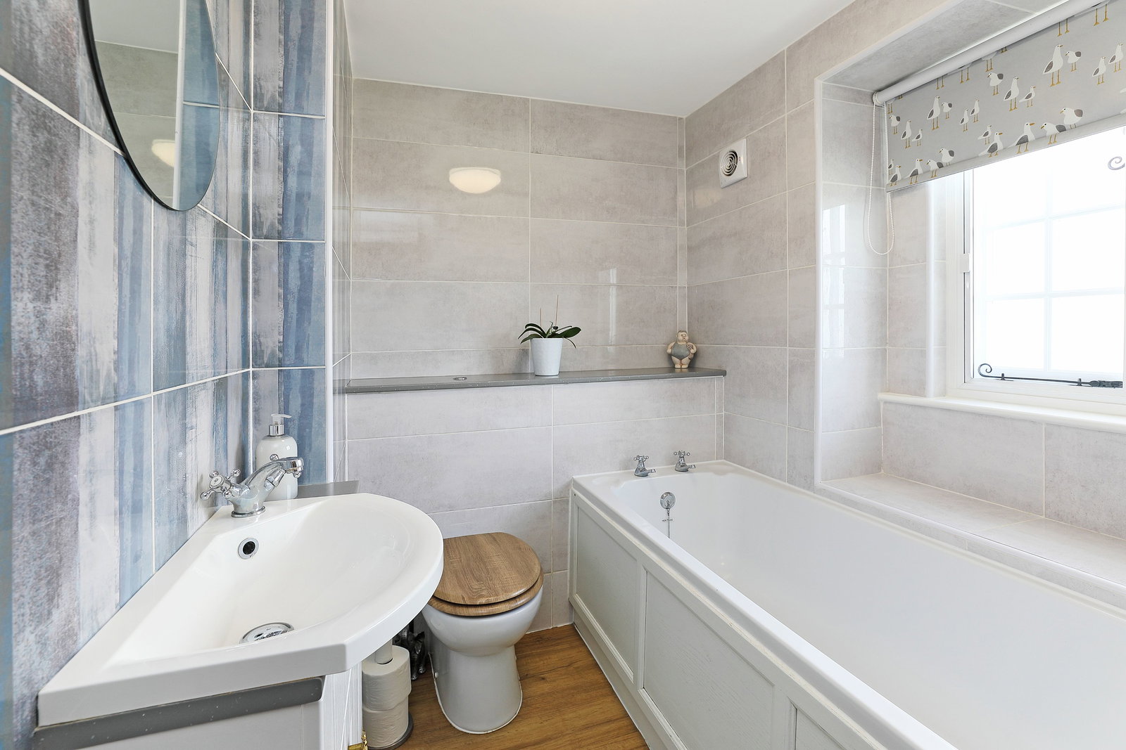 A stylish family bathroom, attractively tiled and fitted with a vanity sink unit, low flush WC and bath. An obscure glazed window provides light and privacy, while a chrome heated towel rail completes the finish.