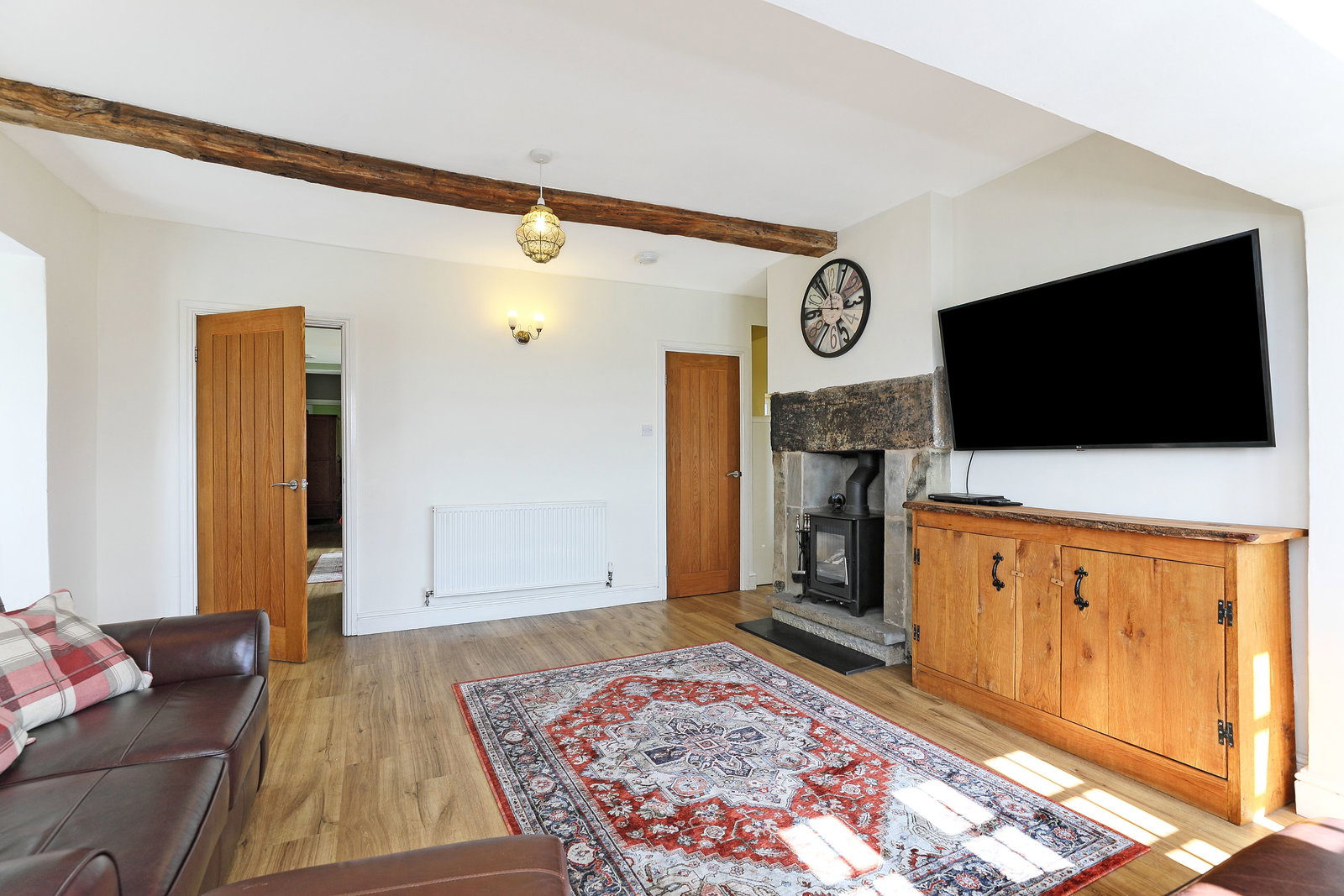 A beautiful principal reception room designed to take full advantage of the surrounding countryside views, enjoyed through the elegant front and side-facing bay windows. The abundance of natural light enhances the sense of space, while the focal point is the impressive woodburning stove set within a characterful stone surround and hearth. Exposed beams add charm, and a useful understairs storage cupboard completes the room, all complemented by stylish multi-panel vinyl flooring.