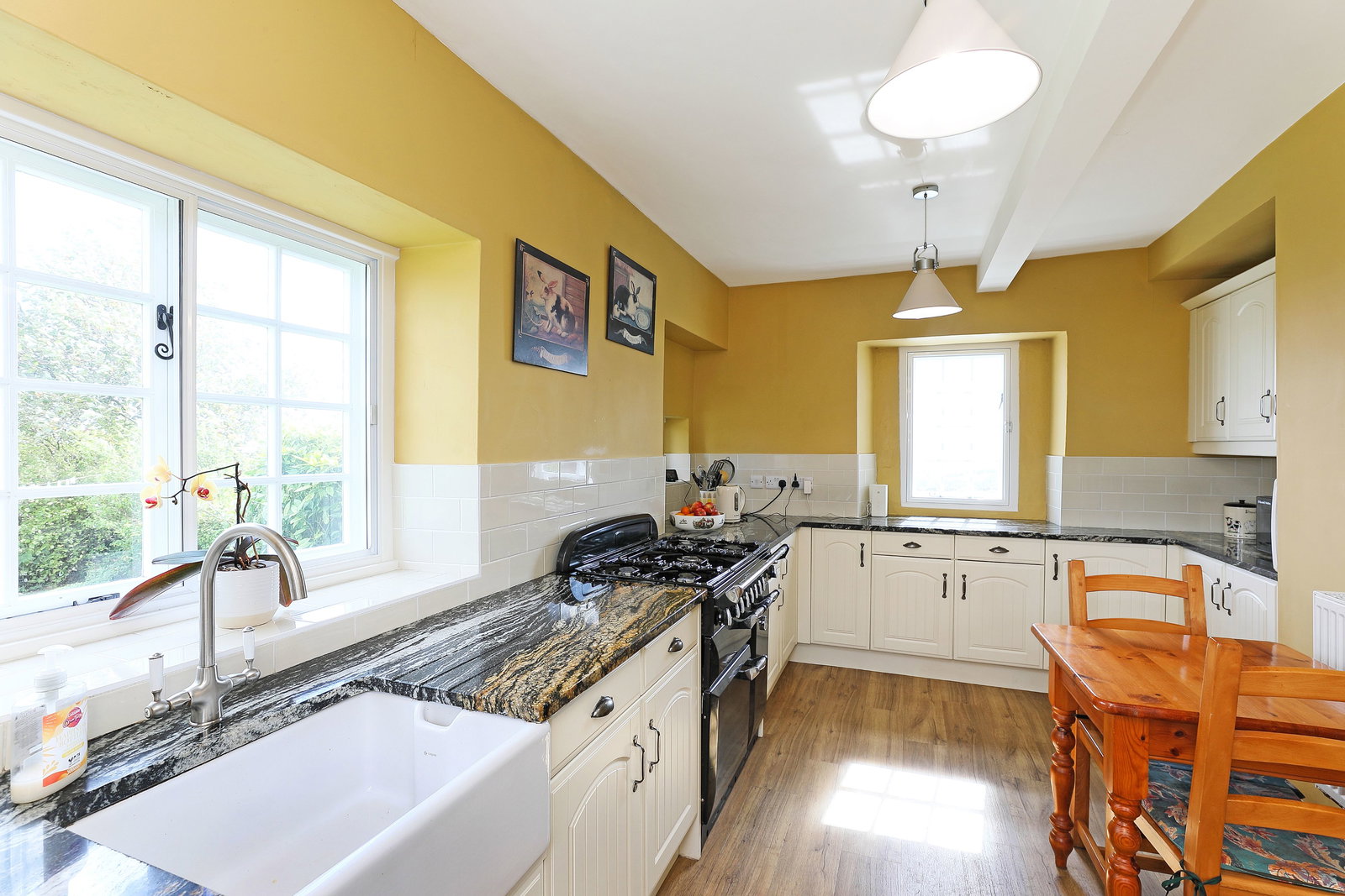 A superbly appointed kitchen, ideal for both everyday family life and entertaining. It features a comprehensive range of attractive fitted wall and base units, centred around a traditional Range cooker. The kitchen is finished with beautiful granite worktops and a Belfast sink, while windows to three elevations flood the room with light and frame breathtaking countryside views. A half-glazed entrance door opens directly onto the private rear garden, and the multi-panel vinyl flooring adds a practical yet elegant touch.