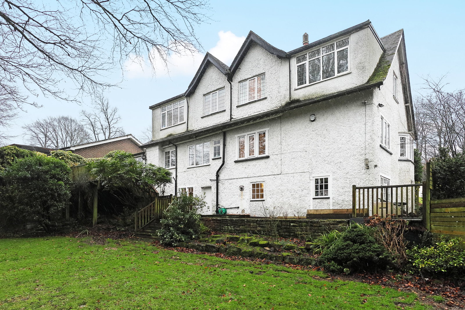 To the front is an attractive gated entrance with a block-paved driveway that provides off-road parking for several vehicles. To the rear, the property enjoys a delightful woodland aspect, with two decked seating areas and a level lawn, creating a private and tranquil outdoor space ideal for entertaining and family enjoyment.