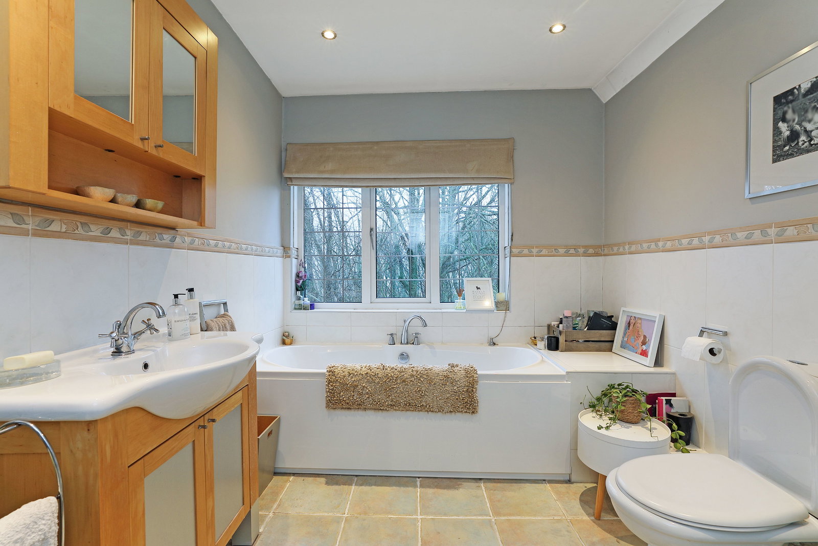 A well-appointed bathroom providing facilities for the remaining bedrooms, finished to a good standard. It comprises a bath, a separate shower, tiled flooring, and stunning views over rural Sheffield as you relax after work.