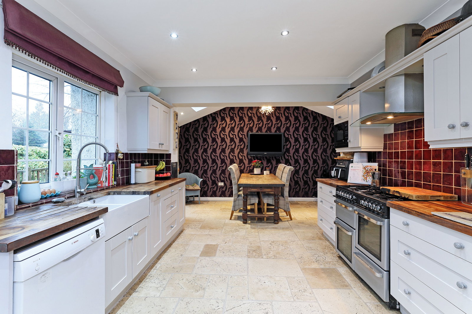 A superb heart of the home, finished with limestone floor tiles and fitted with side-by-side Belfast sinks. The kitchen offers ample dining space and direct access to the garden, making it well-suited to modern family living. The kitchen comprises a large gas oven, an American Fridge Freezer, and patio doors out onto the rear terrace and garden.